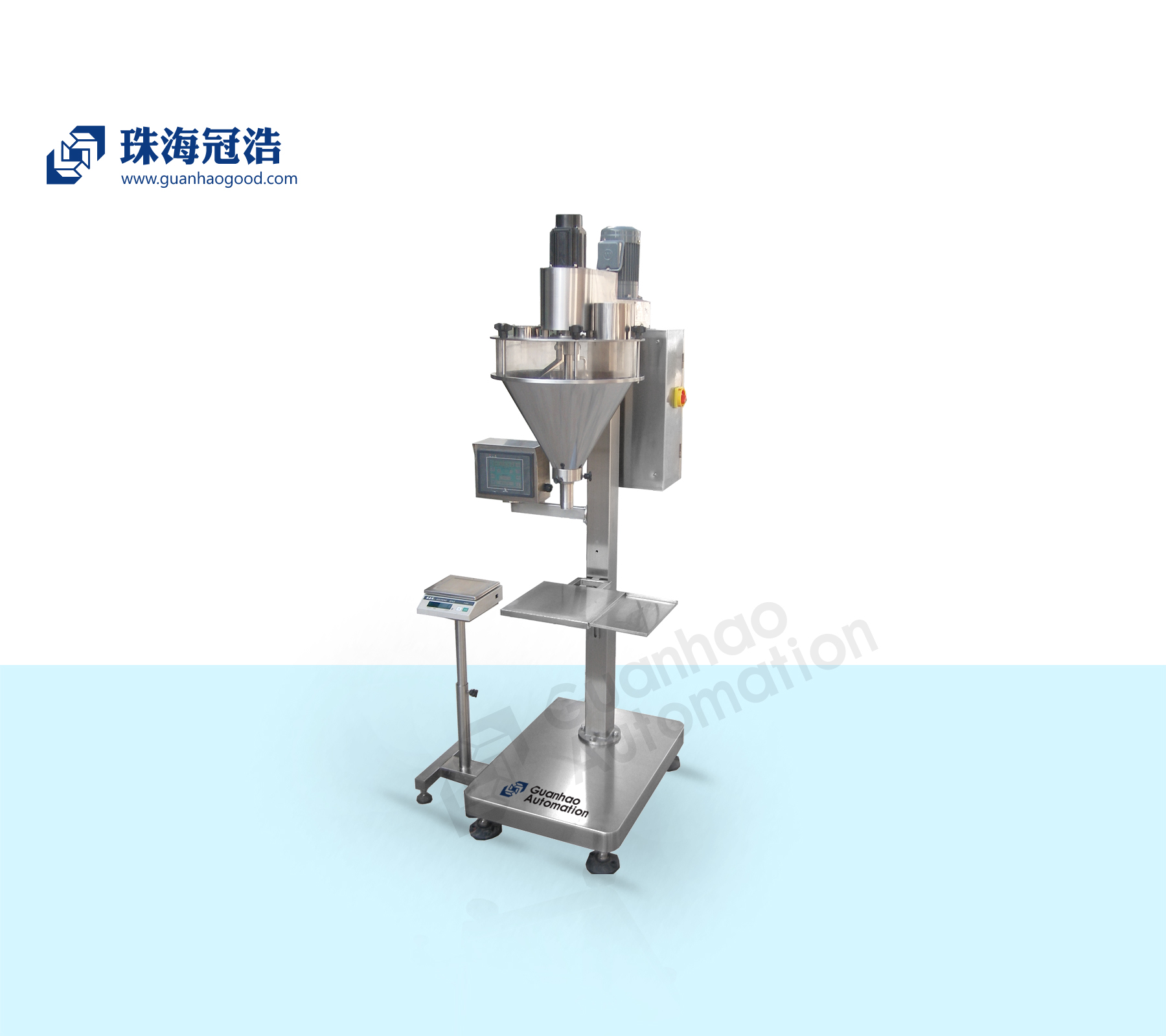 珠海冠浩機(jī)械-GH—LA2半自動(dòng)充填包裝機(jī)主要由充填主機(jī)、電器配電箱、觸摸屏PLC及電子秤組成。